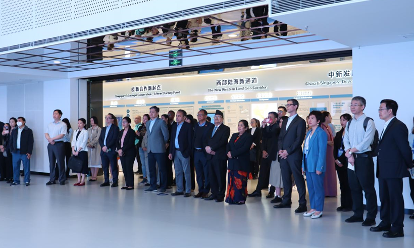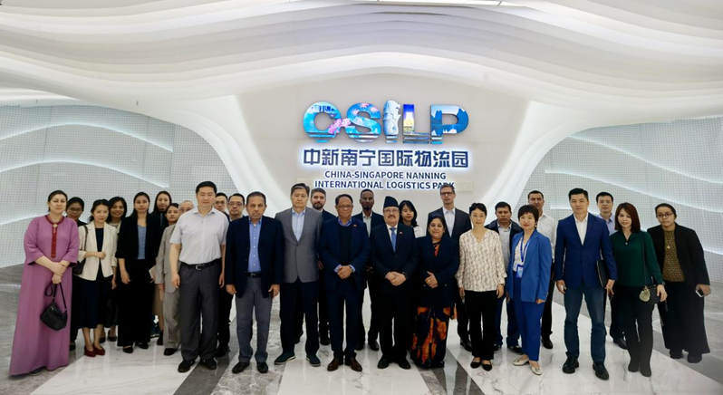 在中新物流園,使節(jié)團通過參觀展廳、聽取介紹、互動交流等方式詳細了解園區(qū)的發(fā)展情況,對西部陸海新通道的戰(zhàn)略地位與廣西在其中的作用有了更深的認識。中新物流園是廣西參與“一帶一路”及推進中國與新加坡互聯(lián)互通、西部陸海新通道建設(shè)、海洋經(jīng)濟發(fā)展的重大項目之一,自2018年10月開工建設(shè)以來,園區(qū)發(fā)展迅猛,產(chǎn)業(yè)集聚效應(yīng)加速顯現(xiàn),現(xiàn)已引進超30家世界500強和中國100強龍頭企業(yè)進行合作,共同實施項目建設(shè)與運營。