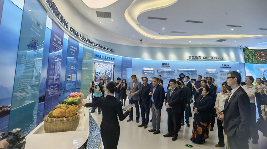 聚焦西部陸海新通道建設(shè),共享發(fā)展新機遇!4月4日,位于中國(廣西)自由貿(mào)易試驗區(qū)的中新南寧國際物流園(以下簡稱中新物流園)迎來了由外交部主辦“駐華使節(jié)廣西行”的外國駐華使節(jié)團,來自東盟、南亞、中亞、拉美17個國家30多名外交官員在外交部外管司司長陳立一行的陪同下實地參訪中新物流園,中國—東盟特色商品匯聚中心副總經(jīng)理盧春梅等熱情接待。