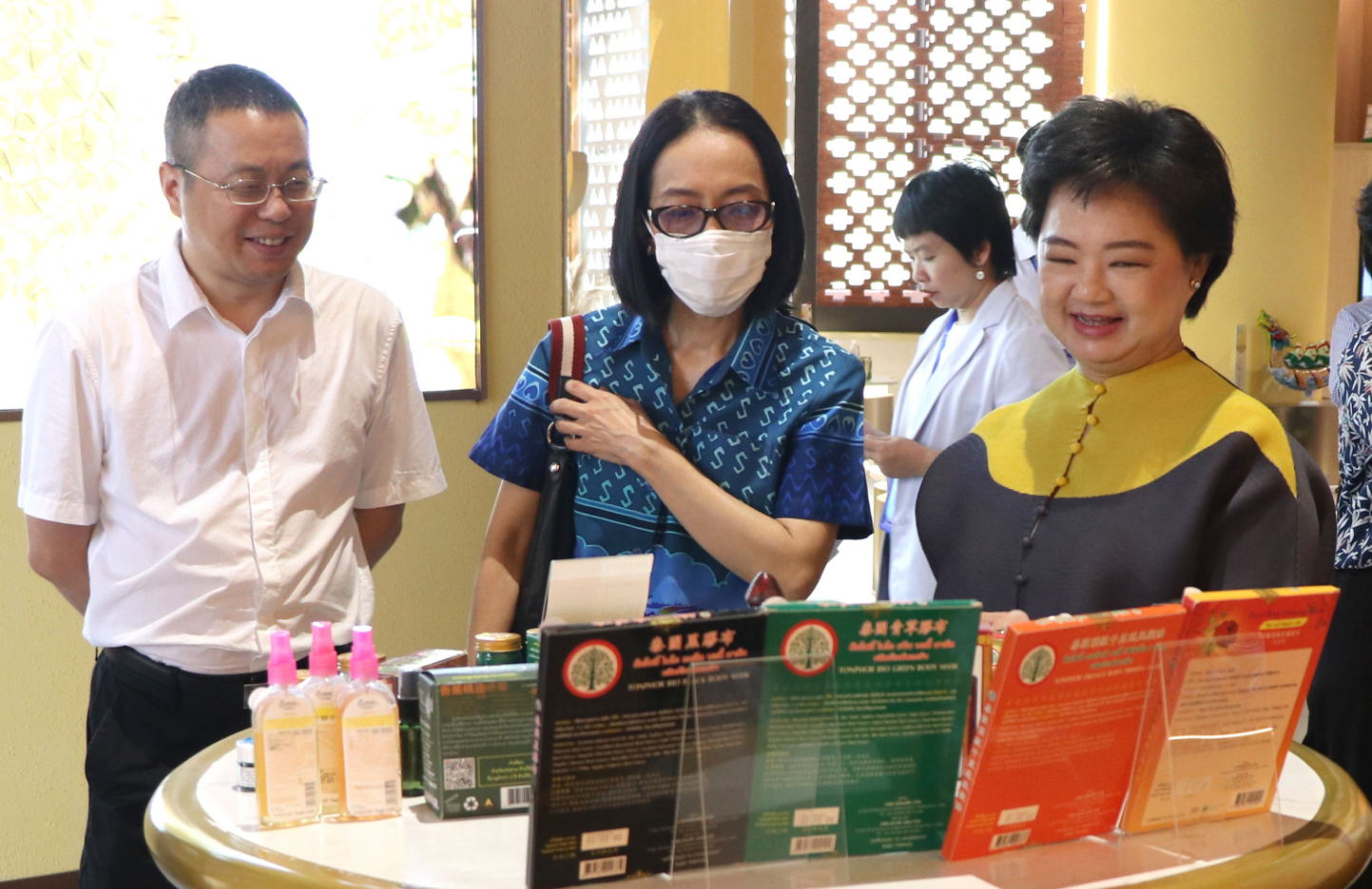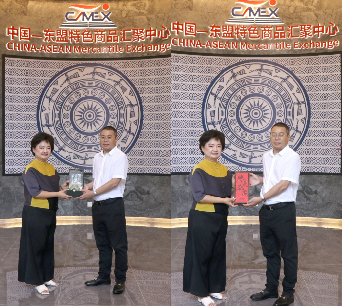 婉娜蓬·戈杜塔等泰國(guó)商業(yè)部巡視員、中國(guó)—東盟特色商品匯聚中心副總經(jīng)理盧春梅等陪同考察。